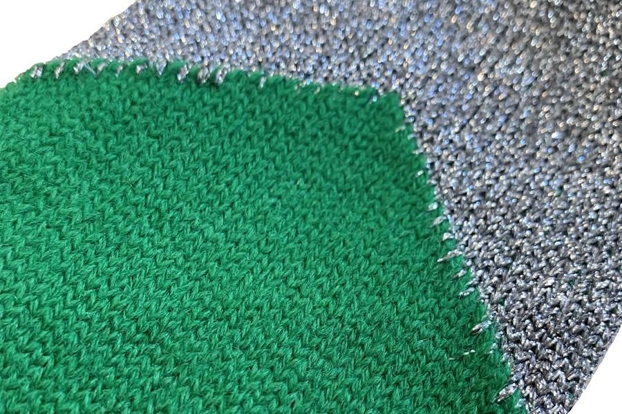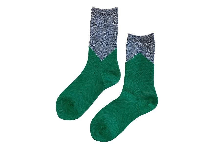 履き口にシルバーが配色されたグリーンのソックスです。細やかなグリッターと逆V字の切り替えがモードなデザインです。日本製