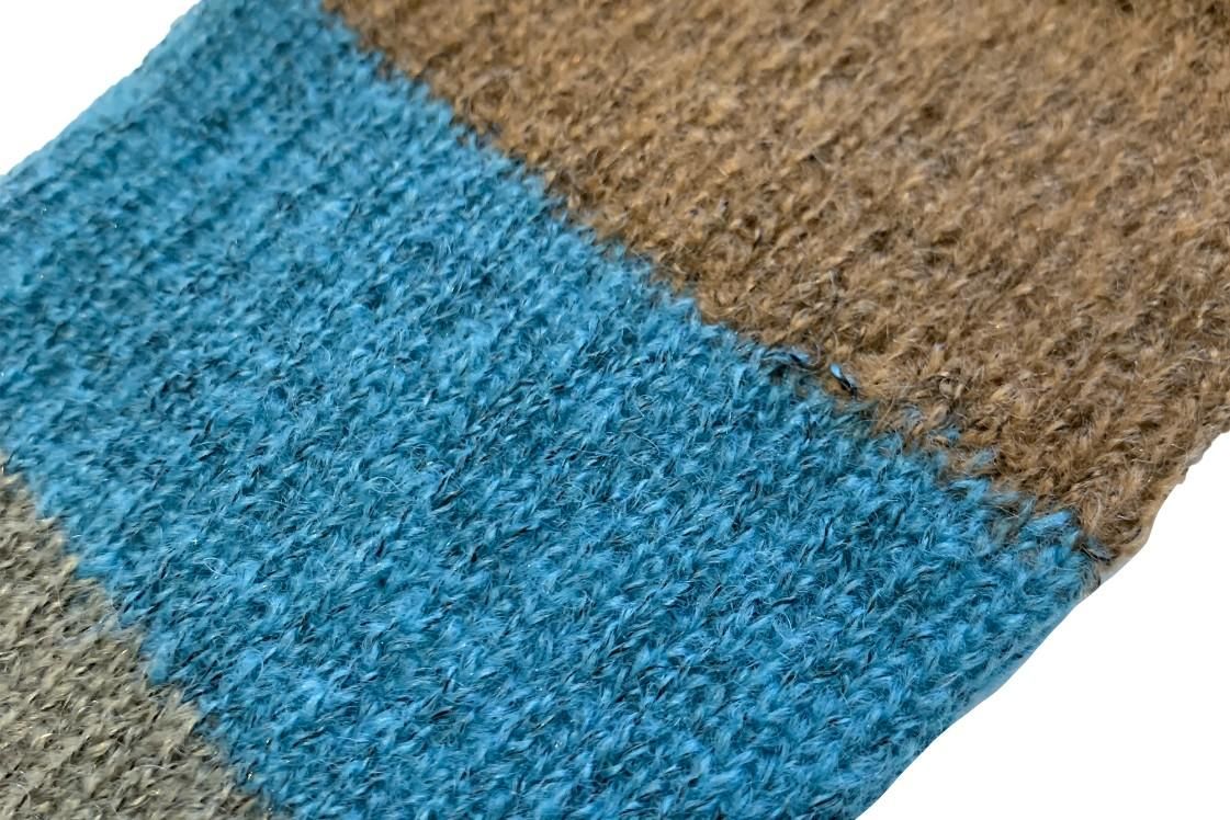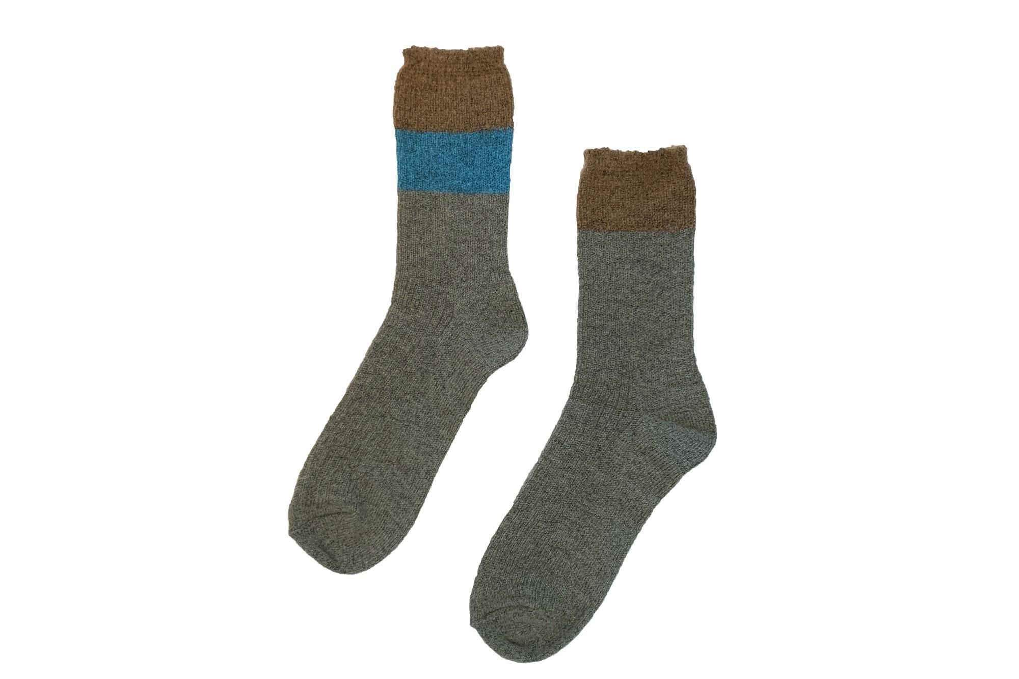 キャメル、ブルー、グレーの配色アシンメトリーソックス。日本製