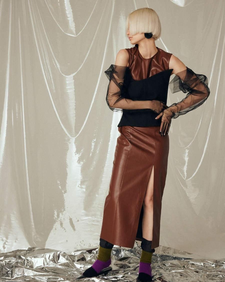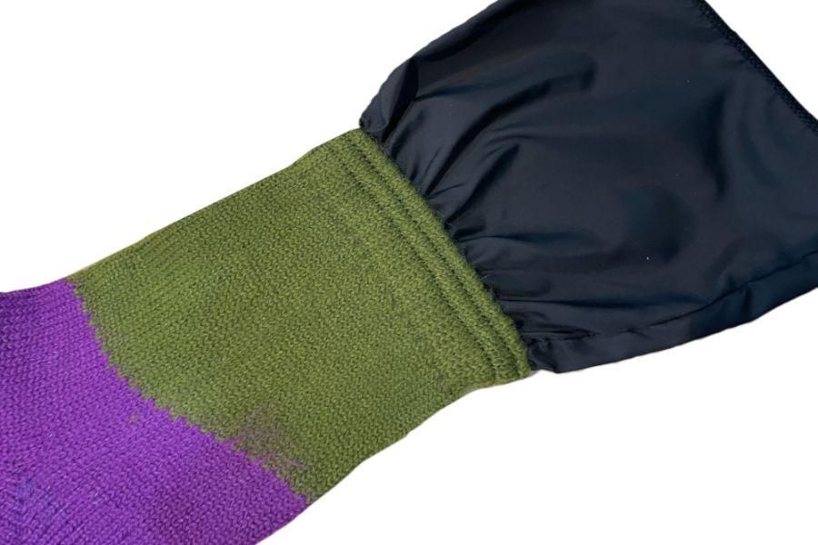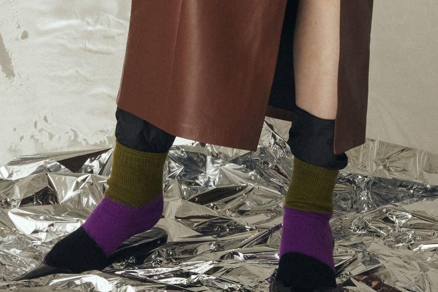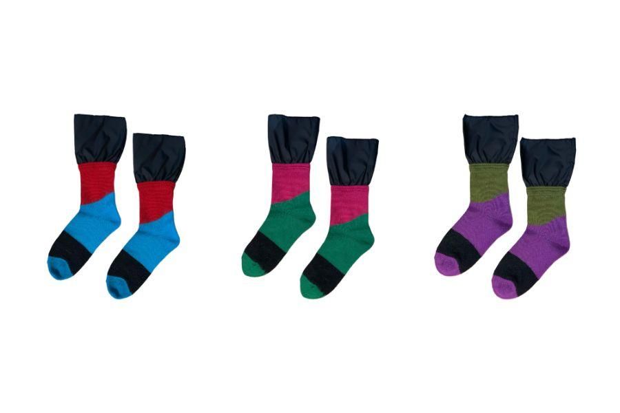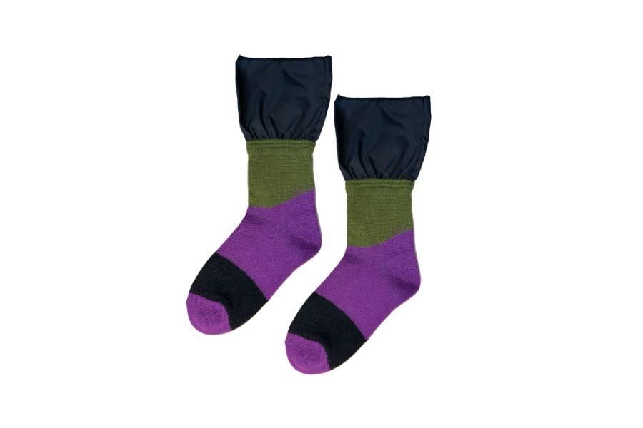 バイカラーソックスにタフタ生地のフリルを付けたFAKUIらしいデザインソックス。暗くなりがちな秋冬のコーディネートに差し色としてぴったりの1足。