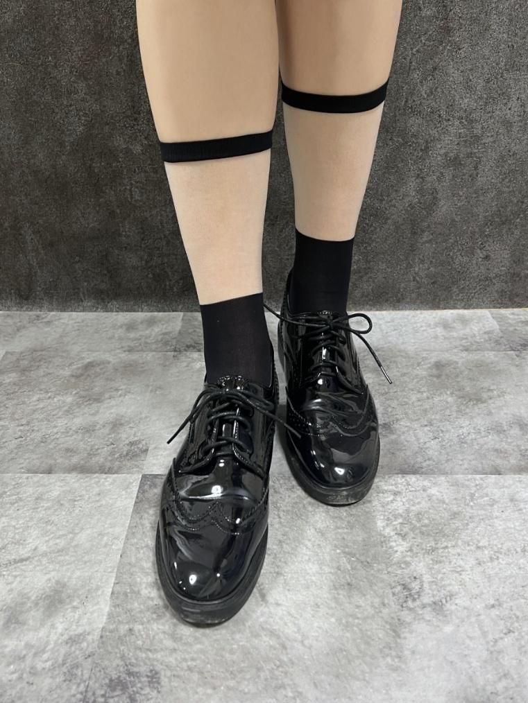 カラーとシースルーを組み合わせた長めのソックス。切り替えの効果で足首がすっきり見えます。薄手の素材のためパンプスなどのフィットシューズでも問題なく着用可能です。
