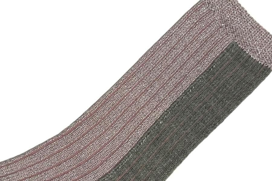 控えめな輝きのラメ糸と、立体感のあるリブ編みが足元に上質な表情を添えるソックス。前面はラメ糸、後面はプレーンの糸で編み分けたデザインがさりげない個性を演出します。コーディネートをワンランクアップさせる、トレンド感のあるアイテムです。