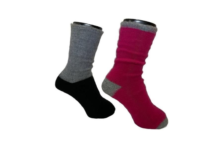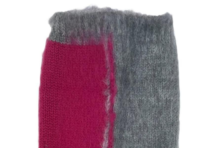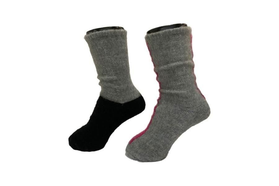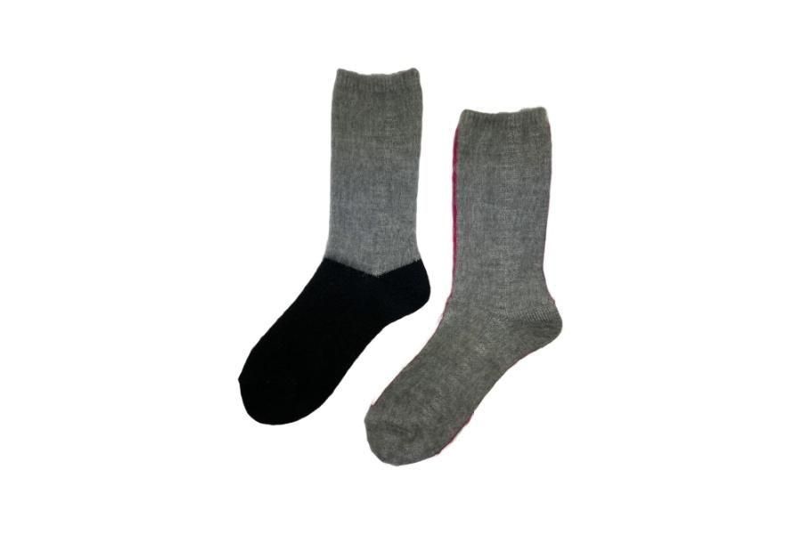 大胆なアシンメトリーの配色が、足元にモダンで個性的なアクセントを添えるソックス。起毛加工のやわらかな風合いが、寒い季節も暖かく包み込みます。洗練されたデザインで、いつもの装いをワンランクアップさせるアイテムです。